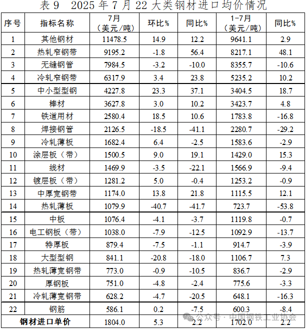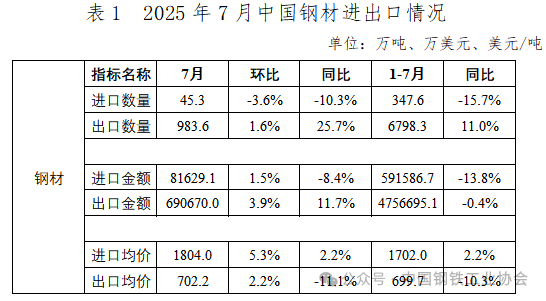 2025年7月,我國出口鋼材983.6萬噸,較上月小幅回升1.6%,出口規(guī)模保持相對(duì)穩(wěn)定,出口均價(jià)702.2美元/噸,較上月小幅上漲2.2%。1-7月,我國累計(jì)出口鋼材6798.3萬噸,同比增長11.0%,出口均價(jià)699.7美元/噸,同比下跌10.3%。7月,我國進(jìn)口鋼材45.3萬噸,環(huán)比下降3.6%,降幅較上月進(jìn)一步擴(kuò)大,進(jìn)口均價(jià)1804.0美元/噸,環(huán)比上漲5.3%。1-7月,我國累計(jì)進(jìn)口鋼材347.6萬噸,同比下降15.7%,進(jìn)口均價(jià)1702.0美元/噸,同比上漲2.2%。