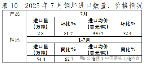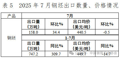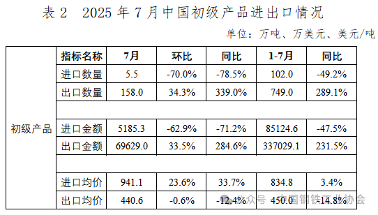 2025年7月,我國出口初級(jí)產(chǎn)品(鋼坯、生鐵、直接還原鐵及再生鋼鐵原料)158.0萬噸,環(huán)比增長34.3%;出口均價(jià)440.6美元/噸,環(huán)比基本持平。1-7月,我國累計(jì)出口初級(jí)產(chǎn)品749.0萬噸,同比增長2.9倍;出口均價(jià)450.0美元/噸,同比下跌14.8%,降幅較1-6月小幅收窄。7月,我國進(jìn)口初級(jí)產(chǎn)品5.5萬噸,環(huán)比大幅下降70.0%;進(jìn)口均價(jià)941.1美元/噸,環(huán)比增長23.6%。1-7月,我國累計(jì)進(jìn)口初級(jí)產(chǎn)品102.0萬噸,同比下降49.2%;進(jìn)口均價(jià)834.8美元/噸,同比上漲3.4%。進(jìn)出相抵,1-7月我國折合粗鋼凈出口7384萬噸,較上年同期增加1424萬噸,同比增長23.9%。