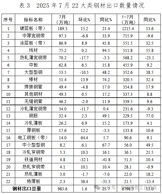 2025年7月,我國鋼材主要品種出口量環(huán)比增減不一。出口前5位的品種并未出現(xiàn)調(diào)整,合計(jì)出口占比也保持穩(wěn)定,但分品種出口量則呈現(xiàn)不同變化趨勢。