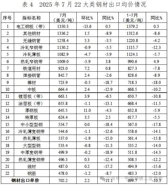 7月,22大類鋼材品種中,有8類品種出口量環(huán)比下降,減量主要來自熱軋板卷產(chǎn)品。其中,熱軋薄寬鋼帶、大型型鋼、冷軋薄寬鋼帶和鐵道用材等4個(gè)品種出口量環(huán)比降幅超過10%,中厚寬鋼帶、焊接鋼管、無縫鋼管及熱軋薄板等品種出口量環(huán)比也出現(xiàn)一定程度下降。其余14類品種出口量環(huán)比出現(xiàn)增長,增量主要來自鍍層板(帶)、涂層板(帶)和棒材。1-7月,鍍層板(帶)是累計(jì)出口量最大的品種,占鋼材出口總量的17.9%;熱軋板卷產(chǎn)品累計(jì)出口量同比繼續(xù)呈下降態(tài)勢,但中厚寬鋼帶和熱軋薄寬鋼帶兩個(gè)主要品種累計(jì)出口量同比降幅小幅收窄;線材和棒材累計(jì)出口量同比持續(xù)擴(kuò)大。7月,多數(shù)品種出口單價(jià)保持在較穩(wěn)定區(qū)間,電工鋼板(帶)出口單價(jià)環(huán)比跌幅最為明顯,為13.6%;厚鋼板出口單價(jià)環(huán)比漲幅最大,為11.0%。1-7月,電工鋼板(帶)和熱軋窄鋼帶2個(gè)品種出口單價(jià)同比已實(shí)現(xiàn)正增長,另有冷軋窄鋼帶等部分品種出口單價(jià)降幅同比收窄。