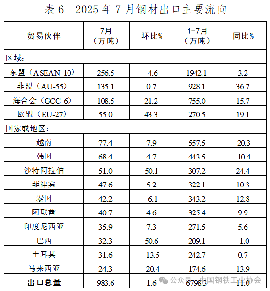 7月,我國對(duì)東盟出口鋼材規(guī)模持續(xù)下降,但降幅收窄;對(duì)海合會(huì)國家和歐盟出口規(guī)模環(huán)比明顯增長。分國別來看,對(duì)越南、韓國及巴西的出口環(huán)比止跌回升,對(duì)其他拉丁美洲和東南亞主要國家的出口環(huán)比則出現(xiàn)不同程度下降。