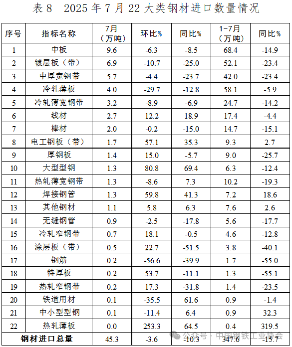 2025年7月,我國鋼材進(jìn)口規(guī)模持續(xù)萎縮,為近10年以來單月進(jìn)口量最低水平。各主要品種進(jìn)口量環(huán)比大多下降,進(jìn)口前5位的品種占當(dāng)月我國鋼材進(jìn)口總量的比重較上月有所下降。7月,我國鋼材的主要進(jìn)口來源及結(jié)構(gòu)仍保持穩(wěn)定,除自中國臺(tái)灣進(jìn)口鋼材環(huán)比回升外,自其它主要國家進(jìn)口鋼材數(shù)量環(huán)比均下降,且降幅大于總體水平。