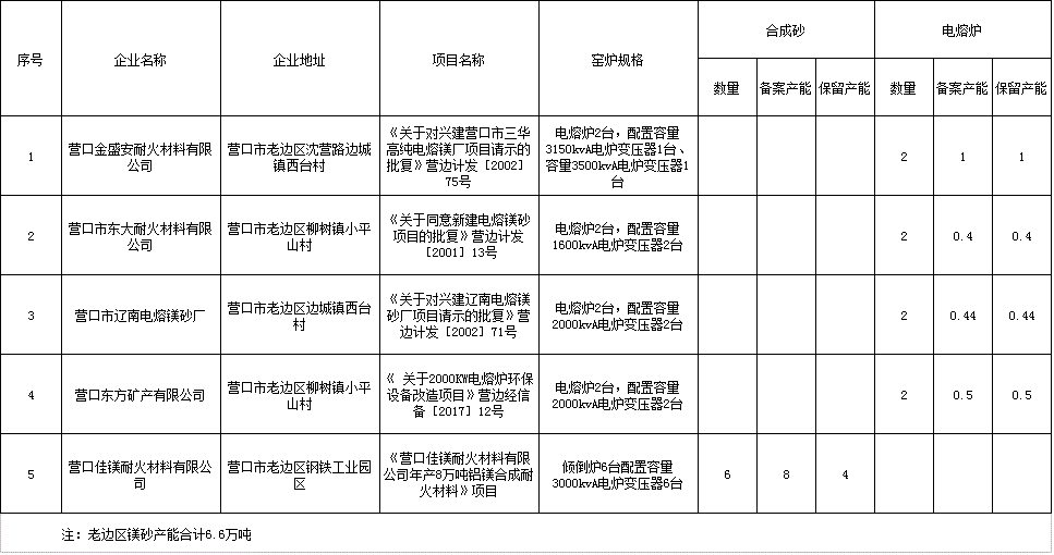 老邊區(qū)鎂砂生產(chǎn)企業(yè)產(chǎn)能壓減結(jié)果明細(xì)