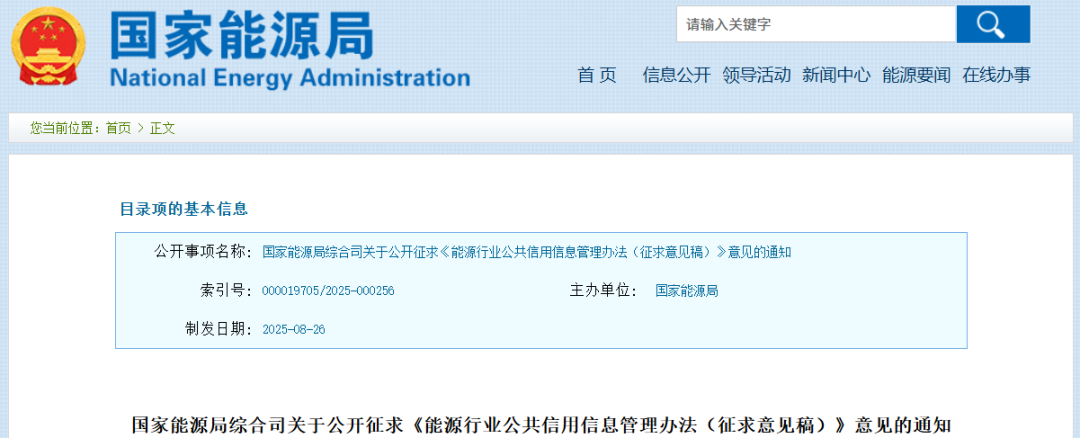 9月2日,國家能源局發(fā)布《能源行業(yè)公共信用信息管理辦法(征求意見稿)》。