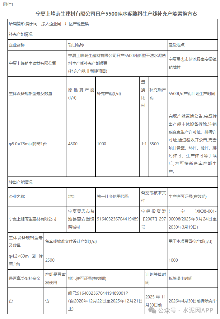 9月3日,寧夏工業(yè)廳發(fā)布“關(guān)于寧夏上峰萌生建材有限公司水泥熟料生產(chǎn)線補足產(chǎn)能置換和產(chǎn)能轉(zhuǎn)出方案的公示”。