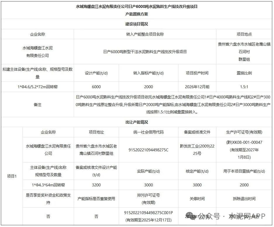 另?yè)?jù)此前貴州工信廳發(fā)布,水城海螺盤(pán)江水泥6000t/d技改升級(jí)項(xiàng)目產(chǎn)能置換方案如下: