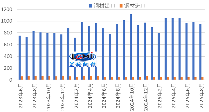 2025年8月我國鋼材月度出口呈現(xiàn)同比微幅增長態(tài)勢。據(jù)海關總署統(tǒng)計數(shù)據(jù)顯示,出口方面,8月份,我國出口鋼材951.0萬噸,同比增長0.1%,增幅較上月回落25.5個百分點;1-8月,我國出口鋼材7749.0萬噸,同比增長10.0%,增幅較上月回落1.4個百分點。進口方面,8月份,我國進口鋼材50.0萬噸,同比下降2.0%,降速較上月收窄7.6個百分點;1-8月,我國進口鋼材397.7萬噸,同比下降14.1%,降幅較上月收窄1.6個百分點。