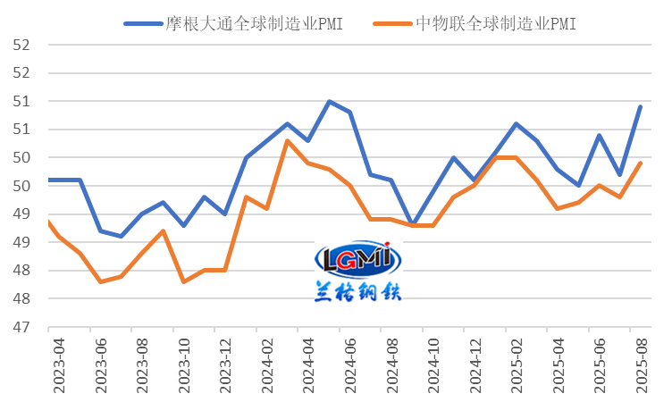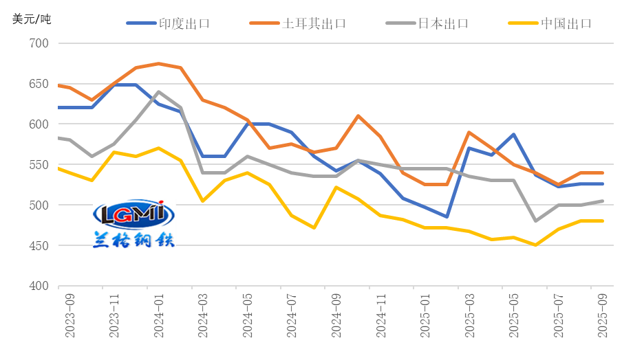 2025年8月份,我國鋼材出口同比呈微幅增長態(tài)勢(詳見圖1),環(huán)比有所回落,較上月減少32.6萬噸,環(huán)比下降3.3%,鋼材進口雖環(huán)比有所回升、同比降幅收窄,但仍處于低位水平,因而8月份我國鋼材對外貿(mào)易仍保持明顯凈出口態(tài)勢,但凈出口同比增速大幅回落。蘭格鋼鐵研究中心測算數(shù)據(jù)顯示,8月份,我國凈出口鋼材901.0萬噸,同比增長0.2%,增速較上月回落27.8個百分點;1-8月份,我國凈出口鋼材7351.3萬噸,同比增長11.5%,增速較上月回落1.5個百分點。當前我國鋼材出口仍保持價格優(yōu)勢,全球制造業(yè)指數(shù)回升,制造業(yè)外需景氣度略有改善,鋼鐵企業(yè)出口訂單指數(shù)回升至擴張區(qū)間,短期內(nèi)對鋼材出口有一定拉動;但全球粗鋼產(chǎn)量有所回升,疊加貿(mào)易摩擦及相關稅費增加仍將抑制鋼材出口。在上年同期鋼材出口基數(shù)繼續(xù)增加(2024年9月鋼材出口1015萬噸)的情況下,9月份我國鋼材出口同比或面臨回落壓力。相關影響因素分析如下:1、我國鋼鐵出口價格優(yōu)勢仍存當前我國鋼材出口價格優(yōu)勢仍存。蘭格鋼鐵研究中心監(jiān)測數(shù)據(jù)顯示,截至2025年9月8日,印度、土耳其、日本熱軋卷板出口報價(FOB)分別為525美元/噸、540美元/噸和505美元/噸,中國熱軋卷板出口報價(FOB)為480美元/噸;目前我國熱卷出口報價分別較印度、土耳其、日本低45美元/噸、60美元/噸和25美元/噸(詳見圖2)。