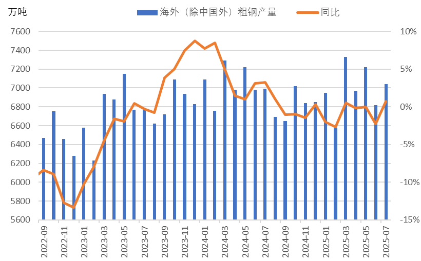 2、海外鋼鐵供應由降轉(zhuǎn)升,我國鋼材出口空間有所抑制2025年7月份全球粗鋼產(chǎn)量繼續(xù)呈現(xiàn)同比下降態(tài)勢。7月全球70個納入世界鋼鐵協(xié)會統(tǒng)計國家的粗鋼產(chǎn)量為1.501億噸,同比下降1.3%。從中國以外粗鋼產(chǎn)量來看,同比由降轉(zhuǎn)升,蘭格鋼鐵研究中心監(jiān)測數(shù)據(jù)顯示,7月份,中國以外全球其他地區(qū)產(chǎn)量為7040萬噸,同比增長0.7%(詳見圖3)。海外供應由降轉(zhuǎn)升,我國鋼材外部需求空間有所抑制。