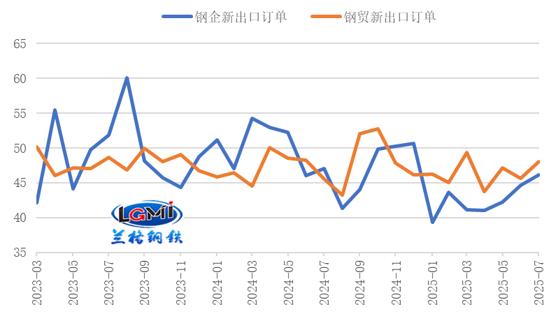 4、我國鋼鐵企業(yè)出口訂單指數(shù)回升至擴張區(qū)間從鋼材出口訂單來看,我國鋼鐵企業(yè)出口訂單指數(shù)繼續(xù)回升至擴張區(qū)間;中物聯(lián)鋼鐵物流專業(yè)委員會調(diào)查的2025年8月份鋼鐵企業(yè)新出口訂單指數(shù)為50.4%,較上月回升4.3個百分點(詳見圖5);中金協(xié)&蘭格鋼鐵網(wǎng)調(diào)研的鋼鐵流通企業(yè)新出口訂單指數(shù)為46.6%,較上月回落1.5個百分點。鋼鐵企業(yè)出口訂單指數(shù)回升至擴張區(qū)間,將對我國后期鋼材出口有所帶動。