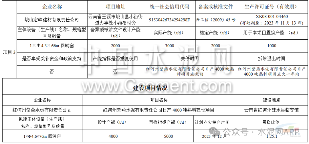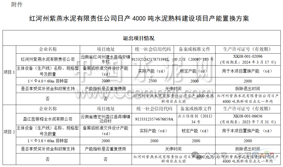 9月11日,云南省工信廳發(fā)布第18號、第19號公告。因故未實施,紅河州紫燕水泥有限責(zé)任公司申請撤銷“紅河州紫燕水泥有限責(zé)任公司日產(chǎn)4000噸水泥熟料建設(shè)項目產(chǎn)能置換方案”。按照原計劃,該企業(yè)擬建一條4000t/d熟料生產(chǎn)線項目,退出紅河州紫燕水泥有限責(zé)任公司2000t/d、盈江昆鋼榕全水泥有限公司2000t/d、峨山宏峰建材有限責(zé)任公司2000t/d共計3條生產(chǎn)線。