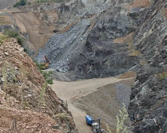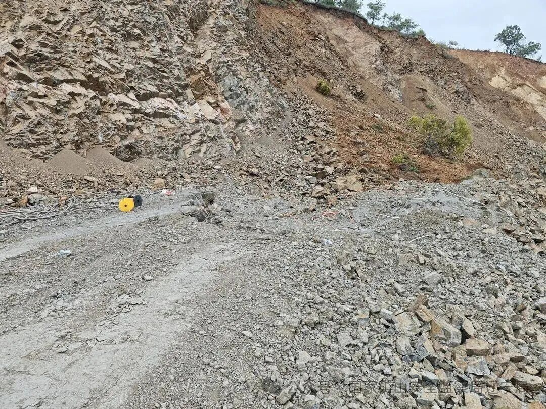 結(jié)束第一處現(xiàn)場處置下山途中,帶隊負(fù)責(zé)人又觀察到對面山上有可疑的大型車輛通行痕跡,在沿一條岔路上山途中,發(fā)現(xiàn)路上水泥地殘留的黑色大型輪胎印,立即帶領(lǐng)監(jiān)察員循跡追蹤。步行至山頂發(fā)現(xiàn),一個廢石傾倒場地赫然出現(xiàn),鏟車和運礦車正在邊坡傾倒廢石。監(jiān)察人員跟隨這輛運礦車,最終發(fā)現(xiàn)一個作業(yè)條件極其危險的深坑開采點,坑內(nèi)有挖掘機(jī)、運礦車正在裝車作業(yè),附近還停放一臺專業(yè)鑿巖臺車。