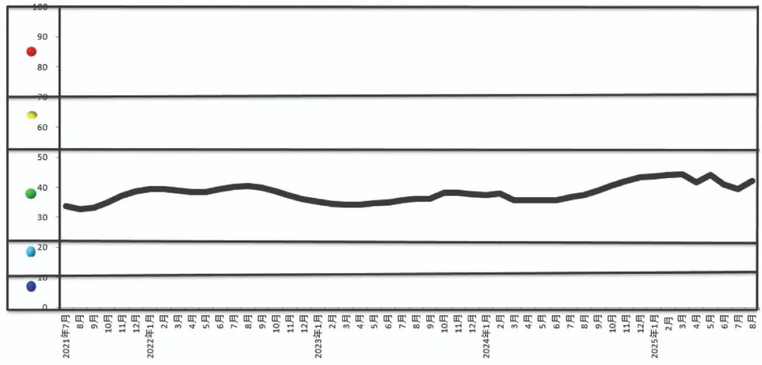 8月份,中國銅產(chǎn)業(yè)月度景氣指數(shù)為42.0,較上月上升2.7個百分點,繼續(xù)保持在 “正常” 區(qū)間運行。中國銅產(chǎn)業(yè)月度景氣指數(shù)變化趨勢如圖1所示。