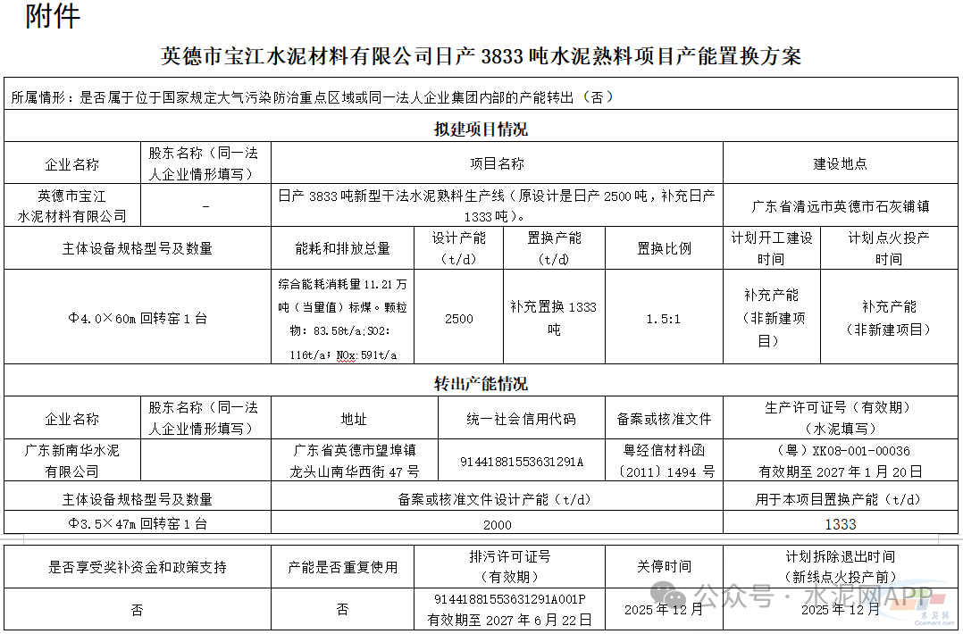 置換方案顯示,英德市寶江水泥2500t/d熟料線補充產(chǎn)能1333t/d,補充后產(chǎn)能為3833t/d,退出產(chǎn)能來自廣東新南華水泥有限公司一條2000t/d熟料生產(chǎn)線,置換比例1.5:1。