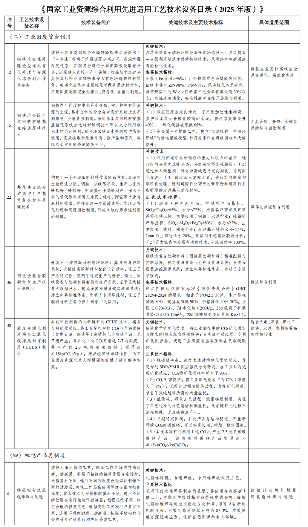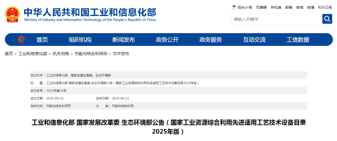 9月11日,為加快推動工業(yè)固廢源頭減量和規(guī)模化利用,提升再生資源綜合利用水平,發(fā)展高端智能再制造,工業(yè)和信息化部、國家發(fā)展改革委、生態(tài)環(huán)境部編制了《國家工業(yè)資源綜合利用先進(jìn)適用工藝技術(shù)設(shè)備目錄(2025年版)》,于工信部官網(wǎng)進(jìn)行了公示。