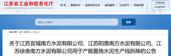9月12日,江蘇省工信廳發(fā)布“關于江蘇宜城南方水泥有限公司、江蘇陽羨南方水泥有限公司、江蘇徐舍南方水泥有限公司用于產能置換水泥生產線拆除的公告”。