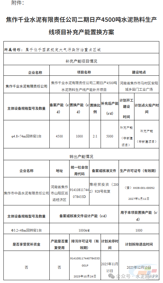 根據(jù)公示,焦作千業(yè)水泥有限責任公司二期日產(chǎn)4500噸水泥熟料生產(chǎn)線產(chǎn)能補齊項目置換產(chǎn)能1000t/d,補充后產(chǎn)能5000t/d,退出產(chǎn)能來自焦作市中晶水泥有限責任公司1000t/d水泥熟料生產(chǎn)線,置換比例為2:1。