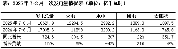 ★新能源替代效應(yīng)大為增強(qiáng)七、八月份,與火電裝機(jī)容量基本相當(dāng)?shù)男履茉闯隽φ?dāng)時,風(fēng)電、太陽能發(fā)電等新能源裝機(jī)的新增發(fā)電量不僅彌補(bǔ)了水電下降帶來的供應(yīng)缺口,還在很大程度上滿足了全社會用電量增長的需求(同比增長3.7%)。這從國家統(tǒng)計局發(fā)布的一次發(fā)電量情況表中可以清楚的看出來。