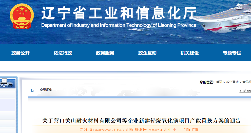 按照《遼寧省人民政府辦公廳關(guān)于推進(jìn)菱鎂行業(yè)高質(zhì)量發(fā)展的實施意見》(遼政辦發(fā)〔2023〕15號)、《遼寧省菱鎂礦浮選及鎂砂行業(yè)產(chǎn)能置換辦法》(遼工信建材〔2024〕18號)要求,根據(jù)菱鎂行業(yè)專項整治工作進(jìn)展,經(jīng)企業(yè)申請、市級審核、省級復(fù)核,我廳于2025年9月19日至10月9日,對營口關(guān)山耐火材料有限公司等企業(yè)新建輕燒氧化鎂項目產(chǎn)能置換方案進(jìn)行了公示,公示期間營口關(guān)山耐火材料有限公司等12家企業(yè)無異議,現(xiàn)予通告。