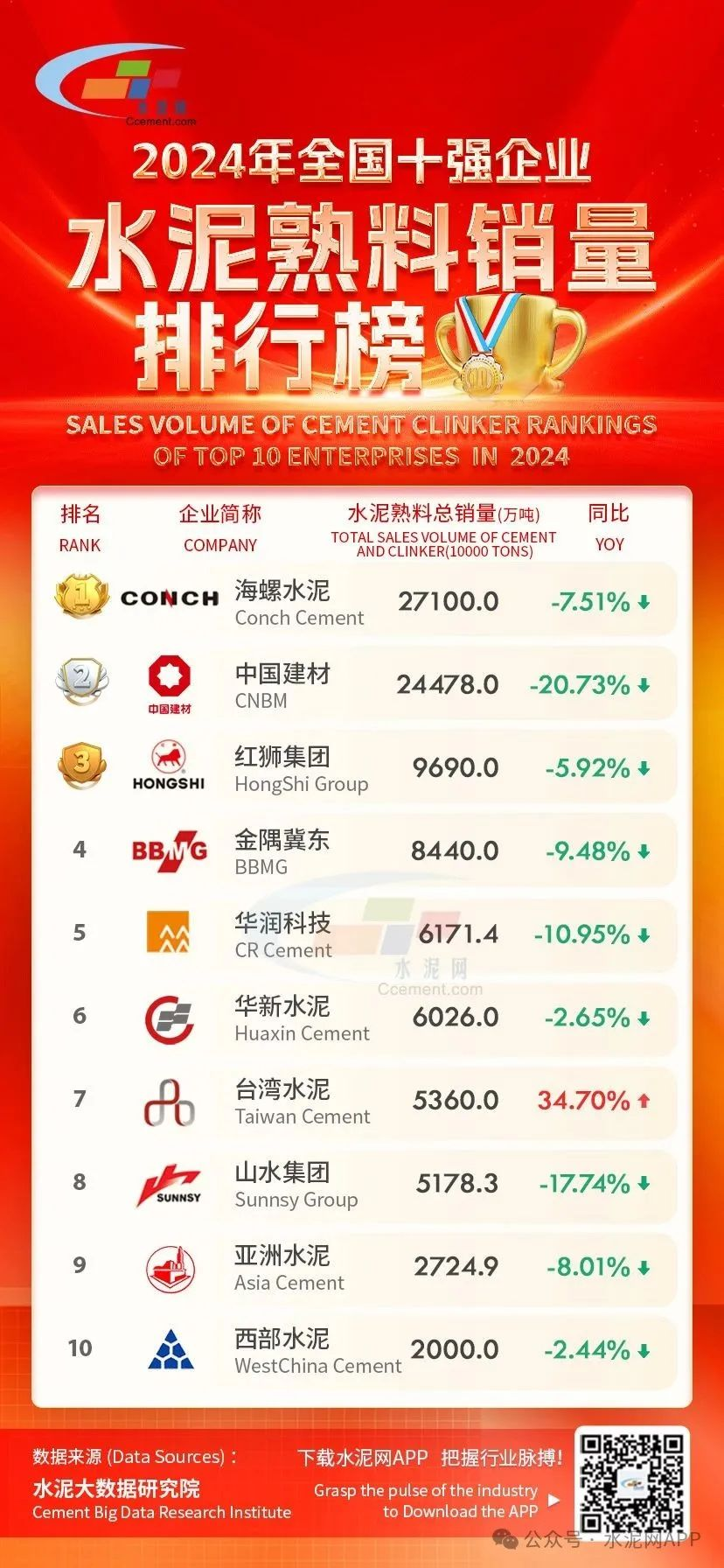 近日,中國水泥網(wǎng)發(fā)布2024年中國水泥熟料總銷量TOP10排行榜。從排名來看,2024年海螺水泥熟料總銷量27100萬噸,超越中國建材位居榜首,華新水泥、臺灣水泥均超過山水水泥,分別提升至第六位、第七位,山水水泥則下降至第八位,西部水泥進(jìn)入前十位。從銷量變化來看,僅有一家企業(yè)銷量出現(xiàn)增長,九家出現(xiàn)下降。2024年,臺灣水泥度完成土耳其、葡萄牙相關(guān)資產(chǎn)收購后,水泥熟料同比銷量大增34.7%;深度參與海外市場的華新水泥、西部水泥明顯跑贏國內(nèi)大盤,降幅較小,分別為2.65%、2.44%;中國建材、山水水泥降幅較大,特別是中國建材,水泥熟料銷量較同期下降近21%,山水水泥超過17%;華潤建材科技降幅在11%左右,金隅冀東、亞洲水泥、海螺水泥、紅獅控股集團(tuán)均低于10%,降幅分別為9.48%、8.01%、7.51%、5.92%。(注:水泥企業(yè)水泥熟料銷量是水泥銷量和熟料外銷量之和(不含自用熟料),既包括企業(yè)在國內(nèi)的銷量也包括在海外的銷量;天瑞水泥暫未披露2024年度年報,不參與此次排名)