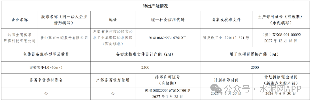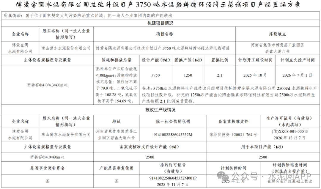 置換方案顯示,博愛金隅3750t/d水泥熟料生產(chǎn)線技改升級項目依托博愛金隅水泥有限公司2500t/d水泥熟料生產(chǎn)線項目技改升級,補充的1250t/d產(chǎn)能由沁陽金隅冀東環(huán)??萍加邢薰?500t/d水泥熟料生產(chǎn)線按照2:1比例減量置換。