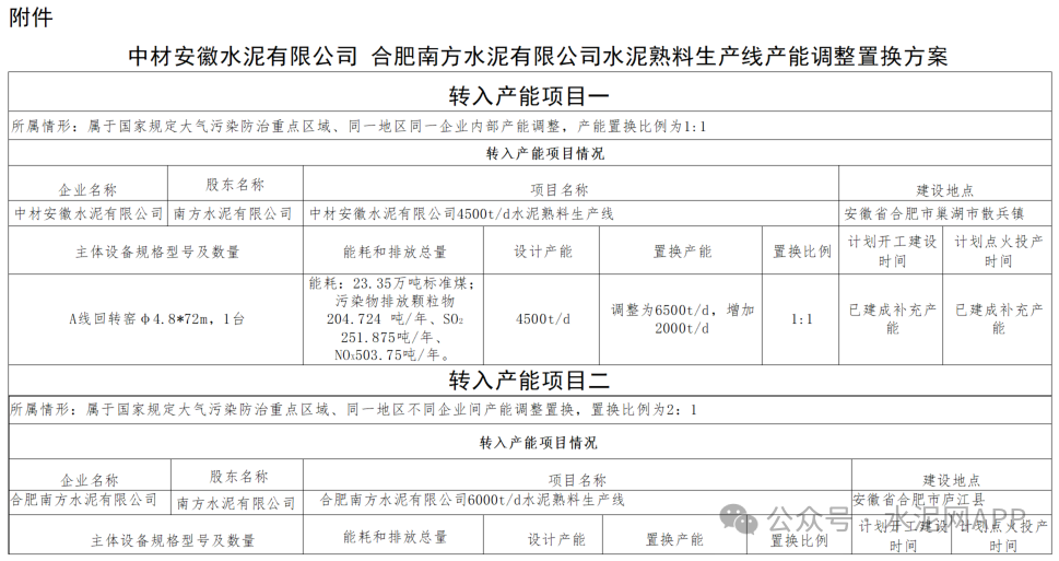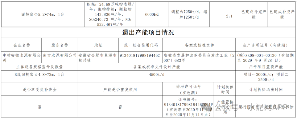 中材安徽水泥有限公司擬將A線水泥熟料生產(chǎn)線(產(chǎn)能為4500t/d)通過補產(chǎn)能方式調(diào)整置換為6500t/d,置換產(chǎn)能來自本公司B線水泥熟料生產(chǎn)線4500t/d產(chǎn)能中的2000t/d,置換比例為1:1;合肥南方水泥有限公司擬將6000t/d水泥熟料生產(chǎn)線通過補產(chǎn)能方式調(diào)整置換到7250t/d,置換產(chǎn)能來自中材安徽水泥有限公司B線水泥熟料生產(chǎn)線4500t/d產(chǎn)能中的2500t/d,置換比例為2:1。以上方案實施后,巢湖市退出1條4500t/d水泥熟料生產(chǎn)線。