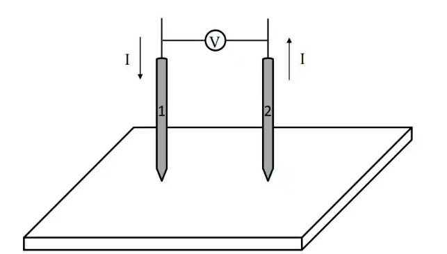 1、兩探針法兩探針法又稱歐姆表法,是一種結構簡單的電阻率測量方法。如下圖所示,兩個探針與恒流源和電壓表連接。由恒流源輸出一個恒定電流,電壓表測量兩個探針間的電壓,然后由歐姆定律得出電阻值。兩探針法多用于大電阻和精度要求不高的情況,其原因在于導線、探針以及探針與樣品的接觸電阻等附加電阻通常在歐姆量級,對于大電阻測量來說附加電阻相對較小,對最終的結果影響有限。然而對于小電阻而言,附加電阻與被測樣品阻值接近甚至高于被測樣品阻值,因此其附加電阻會導致相當大的測量誤差。