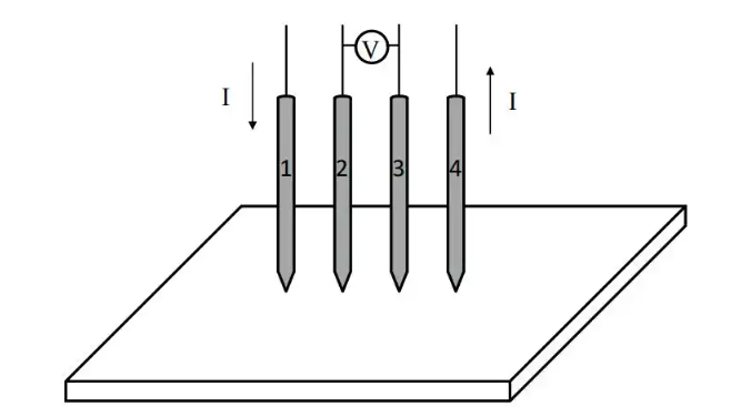 2、四探針法針對兩探針方法的種種不足,開爾文男爵發(fā)展了四探針技術。其工作原理如下圖所示,通常四個探針沿一條直線等間距排列,外側兩個探針(探針 1 和 4)傳輸電流,內側兩個探針測量電壓。恒流源輸出電流 I 到探針 1,電流流經樣品后經探針4 流出形成電流回路。探針 2 和 3 連接電壓表,測量探針兩端的電壓,形成電壓回路。電流和電壓測量不共用探針,而是由各自的一對探針形成回路。根據歐姆定律可得到樣品的電阻值。電壓表的內阻通常在 109 ? 以上,因此流過電壓探針 2 和 3 的電流接近零,因此探針 2 和 3 自身電阻產生的電壓降也接近零,可以忽略。這樣就規(guī)避了導線電阻、探針電阻以及探針與材料的接觸電阻的影響,因此四探針方法比兩探針法測量精度更高,適用范圍更廣。