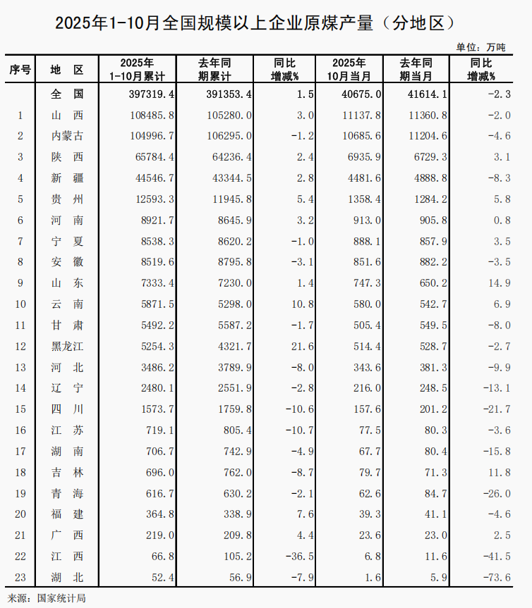 2025年1-10月份全國規(guī)模以上分省區(qū)原煤產(chǎn)量數(shù)據(jù)發(fā)布