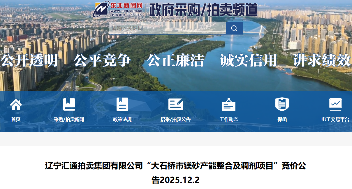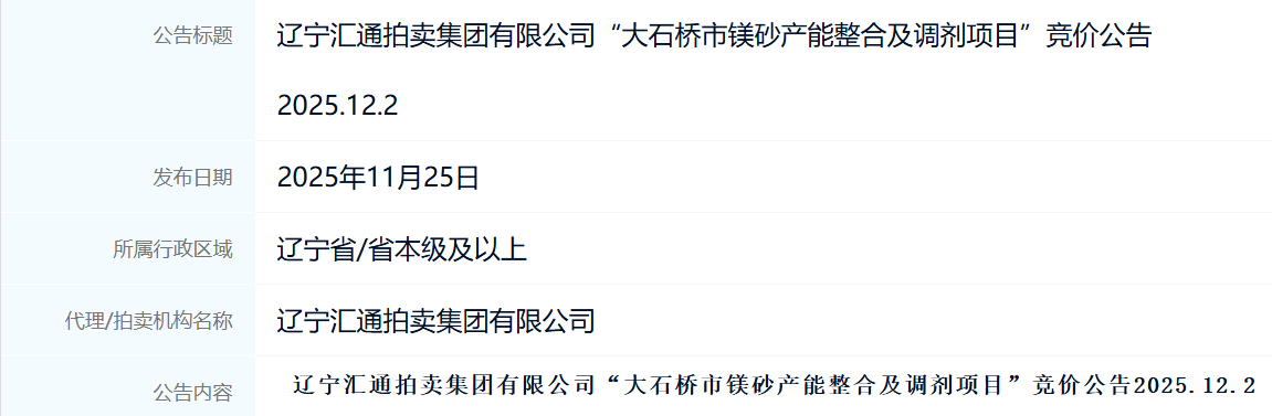 為貫徹落實大石橋市菱鎂產(chǎn)業(yè)結(jié)構(gòu)調(diào)整與轉(zhuǎn)型升級的戰(zhàn)略部署,優(yōu)化資源配置,實現(xiàn)高質(zhì)量發(fā)展。根據(jù)大石橋市鎂砂產(chǎn)能整合及調(diào)劑工作的總體安排,大石橋市政府責(zé)成大石橋市工業(yè)和信息化局委托遼寧匯通拍賣集團有限公司,就已列入大石橋市850萬噸壓減目標(biāo)以及完成產(chǎn)能整合且已在大石橋市工業(yè)和信息化局報備的整合方企業(yè),擬于2025年12月2日組織公開競價活動,以確定產(chǎn)能整合及調(diào)劑的受讓方及補償金額。