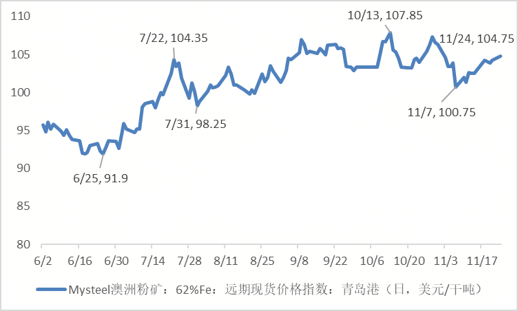 近期市場(chǎng)關(guān)注鐵礦石價(jià)格上漲。單從近兩周的表現(xiàn)來(lái)看, Mysteel鐵礦石62%價(jià)格指數(shù)自11月7日的階段性低點(diǎn)100.75美元/噸上漲至11月24日的104.75美元/噸,上漲4美元/噸,漲幅3.97%。