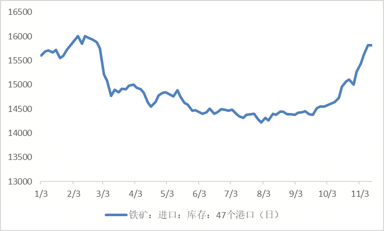 綜合影響47港進(jìn)口礦庫(kù)存連續(xù)7周攀升至11月14日的15813萬(wàn)噸,較國(guó)慶節(jié)前增加1262萬(wàn)噸。