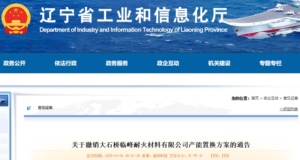 2025年10月10日,我廳對大石橋臨峰耐火材料有限公司新建輕燒氧化鎂項(xiàng)目產(chǎn)能置換方案進(jìn)行了通告。因市場供需發(fā)生變化等原因,企業(yè)決定終止相關(guān)項(xiàng)目的建設(shè)。經(jīng)企業(yè)和營口市工信局申請,現(xiàn)將《關(guān)于營口關(guān)山耐火材料有限公司等企業(yè)新建輕燒氧化鎂項(xiàng)目產(chǎn)能置換方案的通告》中大石橋臨峰耐火材料有限公司年產(chǎn)10萬噸輕燒氧化鎂產(chǎn)品塔式組合自動化環(huán)保豎窯及配套生產(chǎn)線建設(shè)項(xiàng)目產(chǎn)能置換方案予以撤銷。