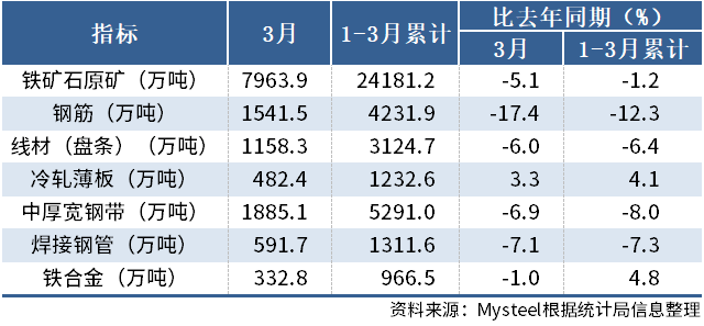 國家統(tǒng)計(jì)局最新數(shù)據(jù)顯示,2026年3月份,中國鋼筋產(chǎn)量為1541.5萬噸,同比下降17.4%;1-3月累計(jì)產(chǎn)量為4231.9萬噸,同比下降12.3%。3月份,中國中厚寬鋼帶產(chǎn)量為1885.1萬噸,同比下降6.9%;1-3月累計(jì)產(chǎn)量為5291.0萬噸,同比下降8.0%。3月份,中國線材(盤條)產(chǎn)量為1158.3萬噸,同比下降6.0%;1-3月累計(jì)產(chǎn)量為3124.7萬噸,同比下降6.4%。3月份,中國鐵礦石原礦產(chǎn)量為7963.9萬噸,同比下降5.1%;1-3月累計(jì)產(chǎn)量為24181.2萬噸,同比下降1.2%。