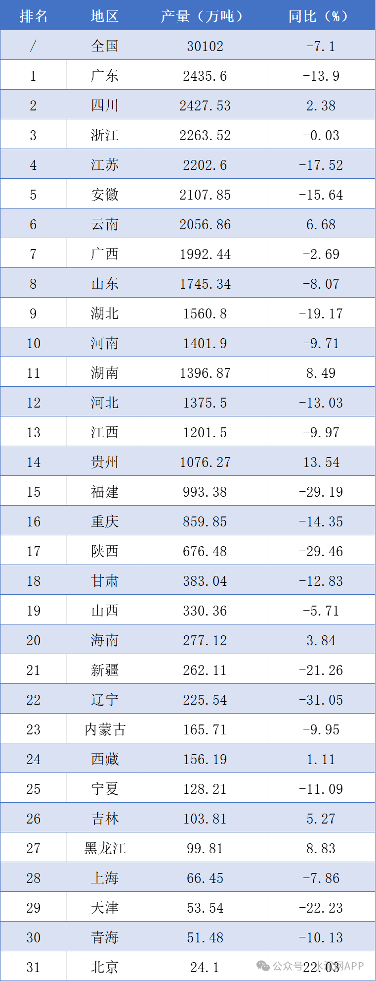 國(guó)家統(tǒng)計(jì)局?jǐn)?shù)據(jù)顯示,2026年一季度全國(guó)水泥產(chǎn)量30102萬(wàn)噸,同比下降7.1%。從分省市數(shù)據(jù)來(lái)看,一季度廣東以產(chǎn)量2435.60萬(wàn)噸位列第一,四川產(chǎn)量2427.53萬(wàn)噸排在第二,浙江產(chǎn)量2263.52萬(wàn)噸排在第三。同比來(lái)看,全國(guó)共9個(gè)地區(qū)上漲,22個(gè)地區(qū)下滑。