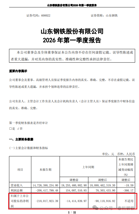 山東鋼鐵4月22日公告,公告稱,2026年一季度,公司錨定“贏戰(zhàn)馬年、騏驥向遠”年度目標,加速變革求生,深耕算賬經(jīng)營,強化團隊攻堅,全力以赴提效率、降成本、拓市場、調(diào)結構、強協(xié)同。但受大宗原燃料價格超預期上行,下游需求釋放不足影響,鋼材價格持續(xù)低迷,進一步擠壓公司利潤空間,兩基地購銷差價同比大幅度下降,其中鋼城基地購銷差價682元/噸,同比下降174元/噸,日照基地購銷差價856元/噸,同比下降115元/噸;日照基地高爐計劃內(nèi)中修、鋼城基地高爐爐況階段性波動導致產(chǎn)量下降、成本上升減少利潤總額約3億元。公司實現(xiàn)營業(yè)收入 147.26億元,同比下降18.59%;利潤總額-2.08億元,同比下降2.87億元;歸屬于上市公司股東的凈利潤-2.18億元,同比下降1.28億元;經(jīng)營活動產(chǎn)生的現(xiàn)金流量凈額-2.89億元,同比下降20.75億元。