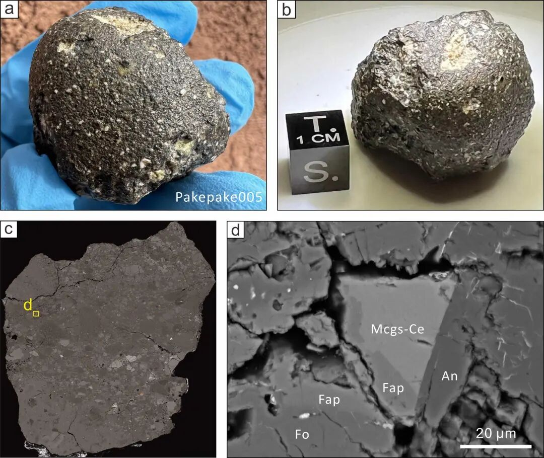 ▲a-b: Pakepake005月球隕石, c: Pakepake005隕石切片電鏡照片, d: 鈰鎂嫦娥石及其共生礦物。