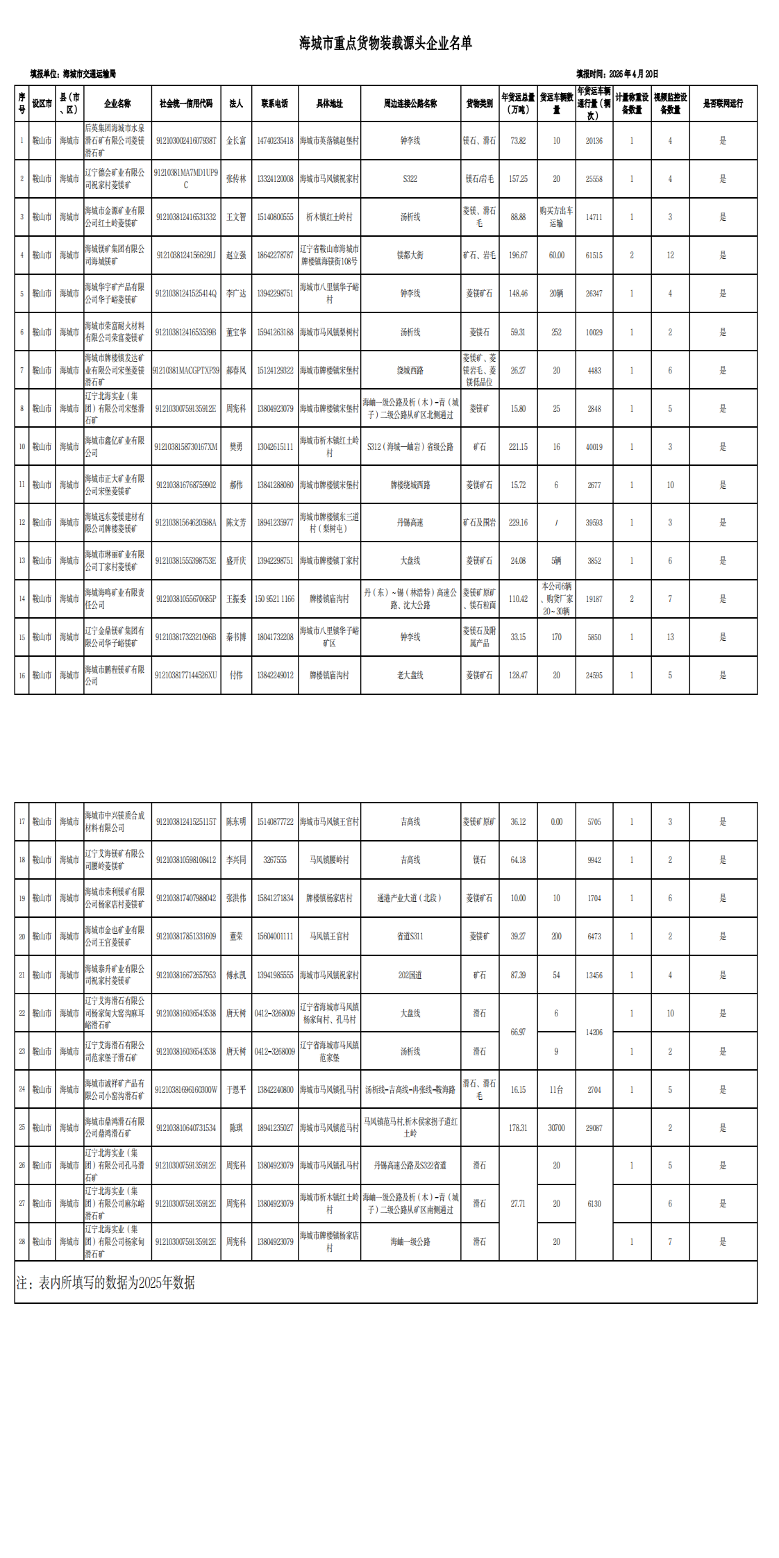 海城市公布重點貨物裝載源頭企業(yè)名單,主要貨物為菱鎂礦石