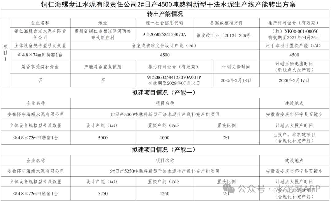 轉(zhuǎn)出產(chǎn)能:銅仁海螺盤江水泥2#4500t/d置換補充產(chǎn)能:安徽懷寧海螺1#1000t/d;2#1250t/d置換比例:2:1