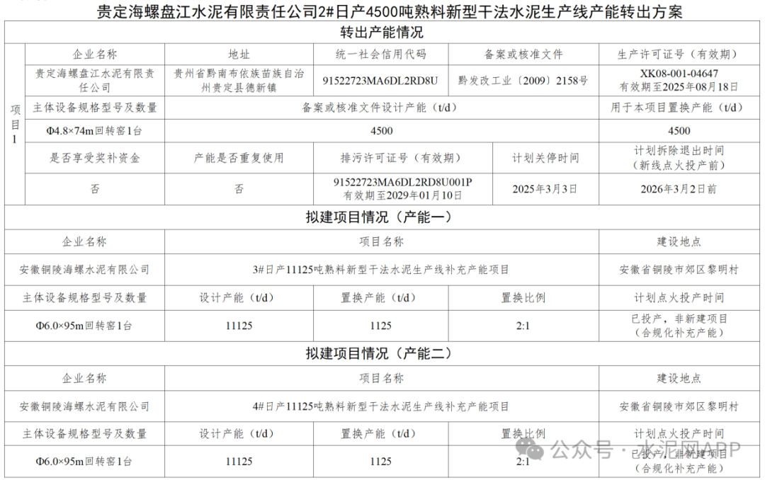 轉(zhuǎn)出產(chǎn)能:貴定海螺盤江2#4500t/d置換補充產(chǎn)能:安徽銅陵海螺水泥3#1125t/d;4#1125t/d置換比例:2:1