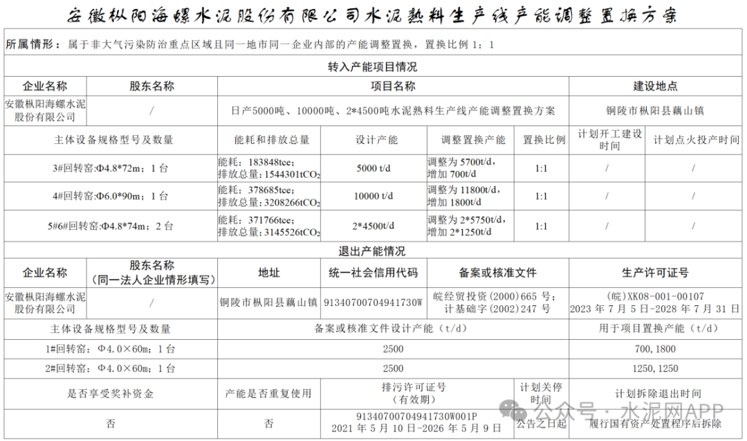轉(zhuǎn)出產(chǎn)能:安徽樅陽海螺1#2500t/d;2#2500t/d置換補充產(chǎn)能:安徽樅陽海螺3#700t/d;4#1800t/d;5#1250t/d;6#1250t/d置換比例:1:1