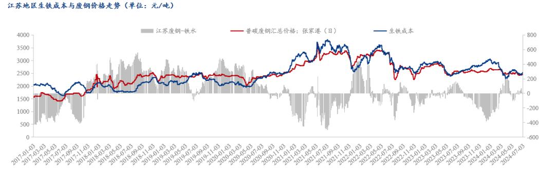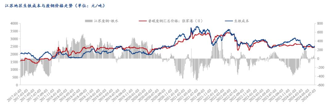 分季度來看,一季度廢鋼較鐵水性價比優(yōu)勢不斷下降,二季度開始,廢鋼性價比有所修復(fù),而后圍繞零軸窄幅震蕩。具體來看:2024年年初,廢鋼較鐵水成本倒掛309元/噸,但隨著鐵礦石從千元/噸開始回落,廢鋼較鐵水的性價比優(yōu)勢也在不斷縮小。至2月末,廢鋼較鐵水成本已經(jīng)相差不大;至3月末,廢鋼價格已經(jīng)高出鐵水成本202元/噸。整個一季度,廢鋼跌幅遠(yuǎn)低于鐵礦石跌幅,廢鋼較鐵水性價比優(yōu)勢完全喪失。