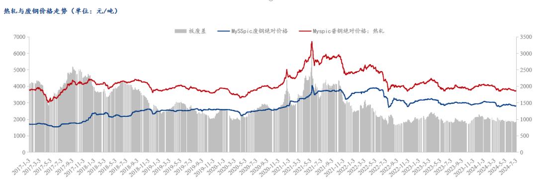 2024年上半年,板廢差整體震蕩收縮,但收縮程度明顯低于螺廢差。板廢差由年初的1042.94元/噸震蕩收縮至912.4元/噸,降幅130.54元/噸。年內(nèi)板廢差最高點出現(xiàn)在1月3日的1055.25元/噸;最低點出現(xiàn)在3月11日的896.92元/噸;平均值966.94元/噸,較2023年螺廢差平均值995.94元/噸下降29元/噸。由于上半年鋼材出口表現(xiàn)較好,板材的整體表現(xiàn)明顯強(qiáng)于螺紋鋼,因此板廢差的收縮程度也明顯低于螺廢差。